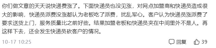 据《中国新闻周刊》2020年的调查,自2019年5月打响行业价格战后,通达系基层网点和基层快递员的收入已经被挤压至生存红线。