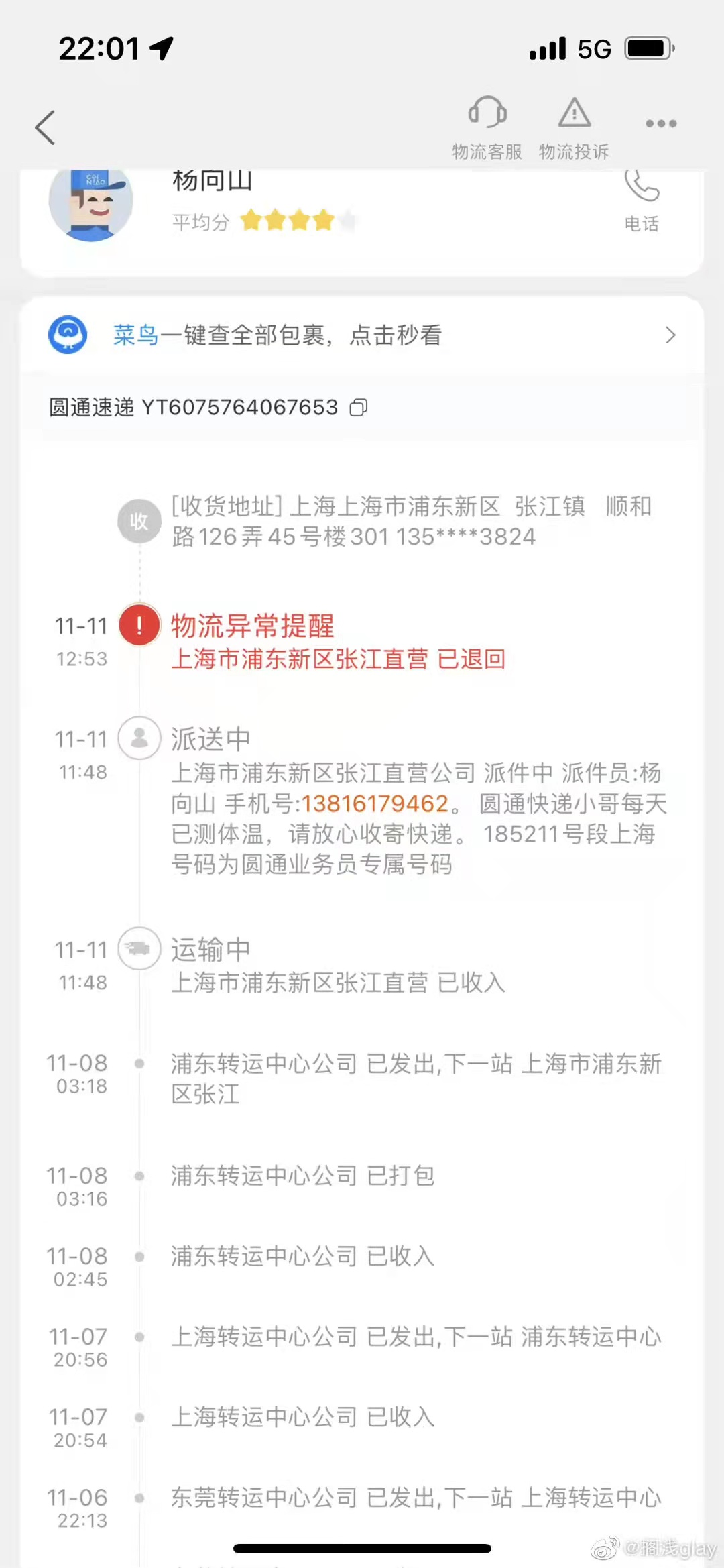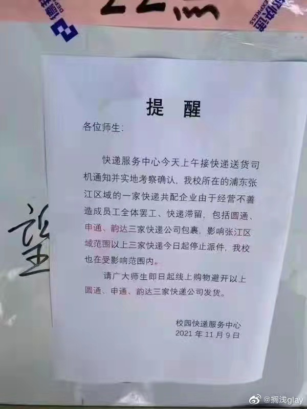 根据网友爆料,“双十一”前后浦东张江区域有快递公司发生罢工,包括圆通、申通、韵达3家快递包裹滞留。