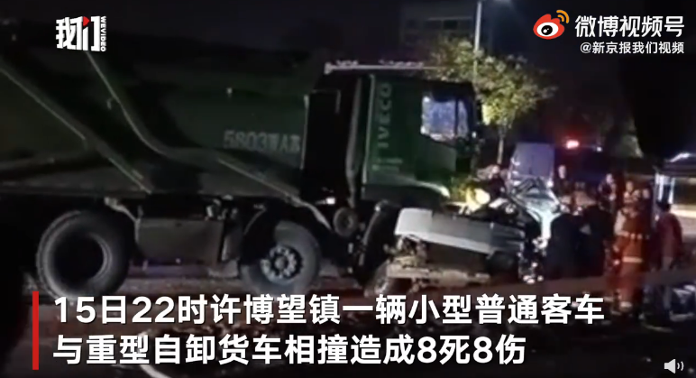11月15日22时许,安徽省马鞍山市一交叉路口发生小型普通客车与重型自卸货车相撞的事故,已造成8死8伤。