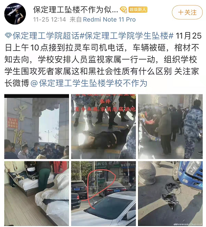 (半军事化管理下的保定理工学院,学生坠亡,部分学生在学校组织下围攻讨要说法的家长)