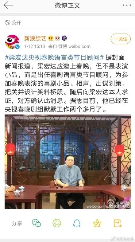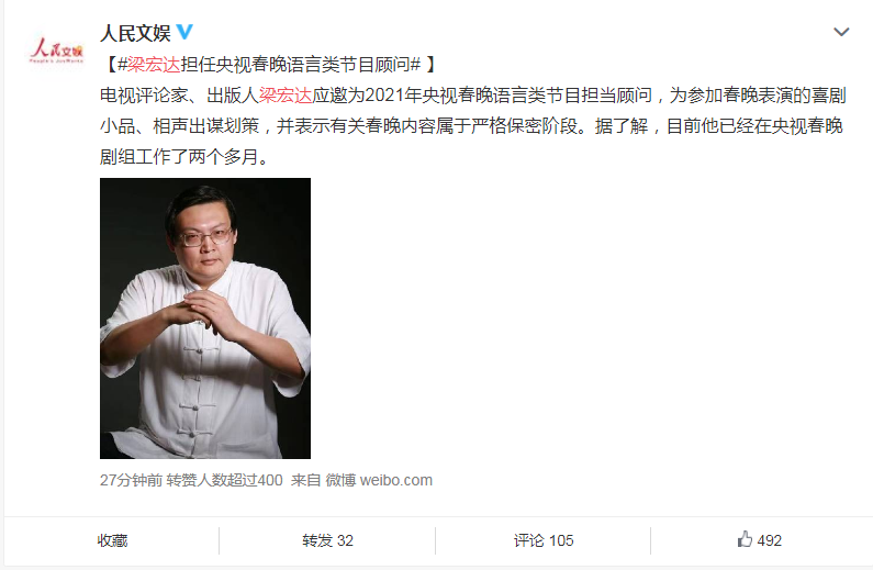 今天,小编刚刚看到新浪微博认证为“环球人物旗下文娱平台”的“人民文娱”发布消息称:梁宏达应邀为2021年央视春晚语言类节目担当顾问,目前他已经在央视春晚剧组工作了两个多月。