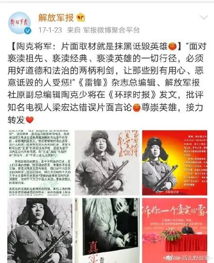 已经非常明显,梁宏达把代表共产主义精神的雷锋,为人民服务的焦裕禄,代表集体主义精神的草原英雄小姐妹、代表保家卫国不怕牺牲精神的志愿军战士,代表革*命造*反的白毛女,统统都给否定了!
