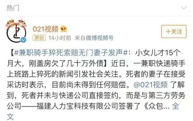 今年4月份,35岁的上海顺丰员工猝死,他每天穿着顺丰工作服至少工作12个小时,连过年都没有回家。可猝死之后,顺丰却说这不是他们员工,而是第三方的外包工。顺丰只愿意提供两万元的“人道主义”补偿,后来因为此事被曝光,这两万块也不给了。