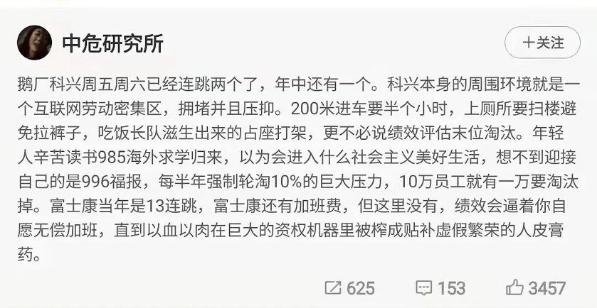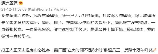 他被大厂以每天工作不足八小时为由,强制解除劳动合同,在两年多的时间里,他面对资本的封锁,只身一人起诉鹅厂,追讨500多万加班费和年终奖。终于虎口拔牙,拿回9万多元的年终奖。他的微博被长期限流,点赞关注不过个位数,但毛星云自杀之后,他的一篇声讨资本家的微博火了起来。
