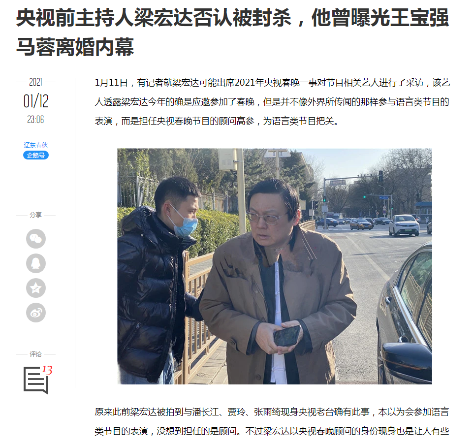 随着舆情的持续发酵,封面新闻记者采访到了一些明星并得到梁宏达本人的证实:梁宏达应邀为2021年央视春晚语言类节目担当顾问,目前他已经在央视春晚剧组工作了两个多月。