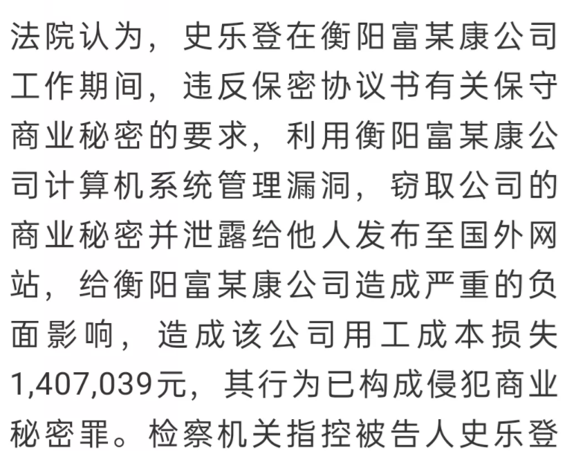 中下旬,衡阳某康前员工史乐登因曝光企业非法用工被判刑的消息曝光,理由是泄露商业秘密。