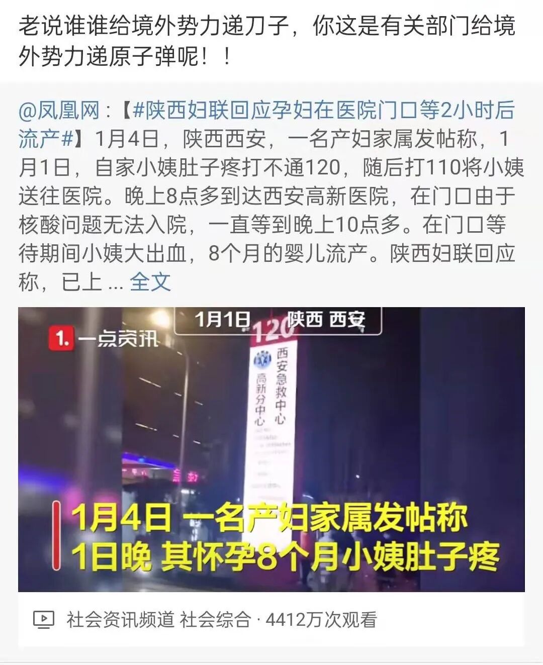 言归正传,疫情中的西安又发生了一起悲剧,一位孕妇在新年第一天的晚上因为核酸检测超时被西安高新医院拒之门外,耽误了两个小时宝贵的救治时间,最终导致八个月大的胎儿流产。