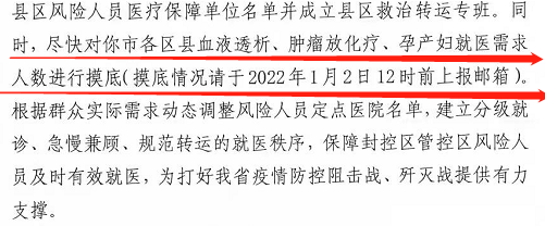 就诊时需要提供24小时核酸检测阴性报告(实效以各医院防控要求为准),并要求通过社区提前联系医院预约。值得注意的是,该函还要求西安市尽快统计各区县血液透析、肿瘤放化疗、孕产妇就医需求人数,并将摸底人数上报,以便根据群众需求动态调整风险人员定点医院名单。