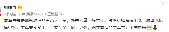 消息一出,老胡看了很高兴,声称南海是“百慕大三角,外来力量凶多吉少”。