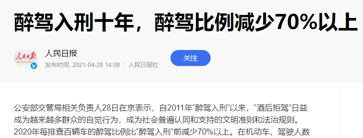 醉驾入刑十年之际,有关部门表示,2020年醉驾比率比醉驾入刑前减少70%以上;2011-2021年间,在全国机动车增加1.81亿、驾驶人增加2.59亿,年均增加1800万辆、2600万人的情况下,酒驾醉驾肇事导致的伤亡事故相比上一个十年减少了2万余起。