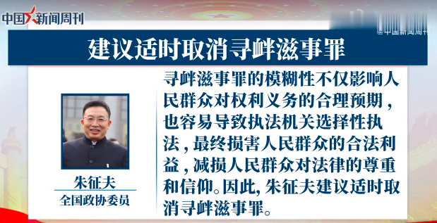 “两会”马上要召开了,代表朱征夫律师建议适时取消寻衅滋事罪。