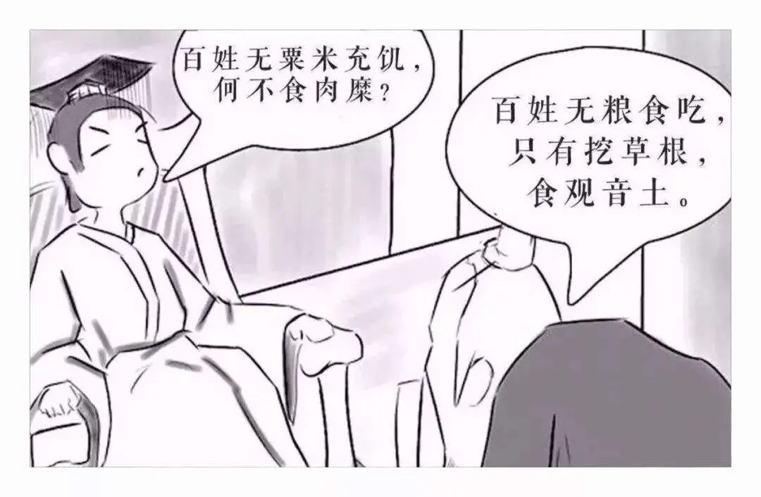 晋惠帝有一句名言,叫做“何不食肉糜”,讲的是有一年发生饥荒,百姓没有粮食吃,只有挖草根,吃树皮,许多百姓因此活活饿死。晋惠帝因此发出这句贻笑千年的名言。