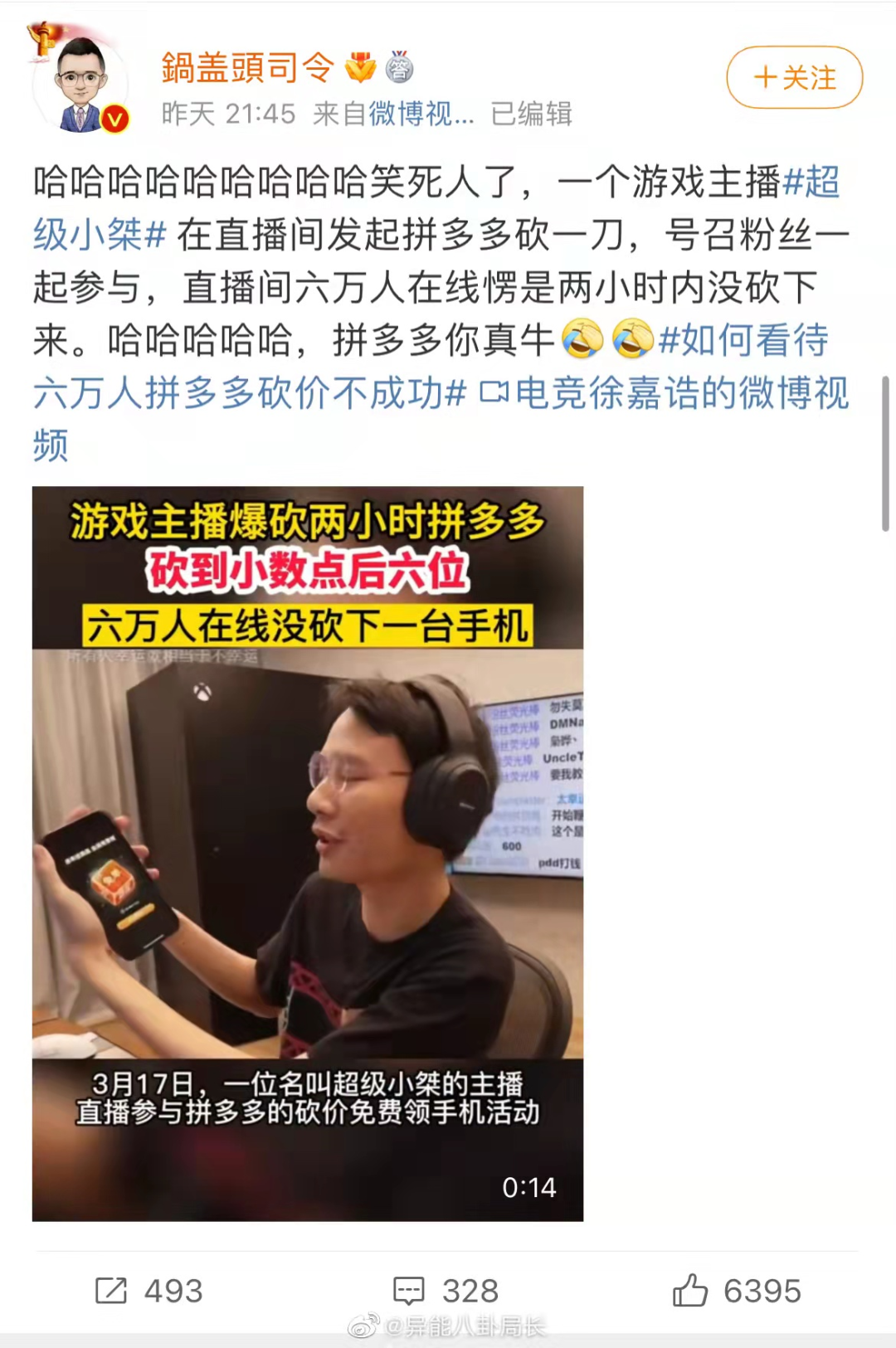 数万人在线帮砍,砍得拼多多屏蔽了链接。主播给客服致电询问原因,得到的回应是“不能刷机器人”,随后便挂断了电话。