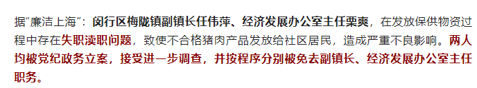 而闵行区梅陇镇最近查处的一起黑心商人发国难财的案件更加让人警惕。梅陇镇花费760万余元采购了黑心商人价值300万左右的变质猪肉供应给居民,超过150%的利润就如此轻轻松松地到手了。要说其中没有利益输送,鬼都不信。梅陇镇的两名芝麻官因此被立案调查。