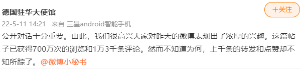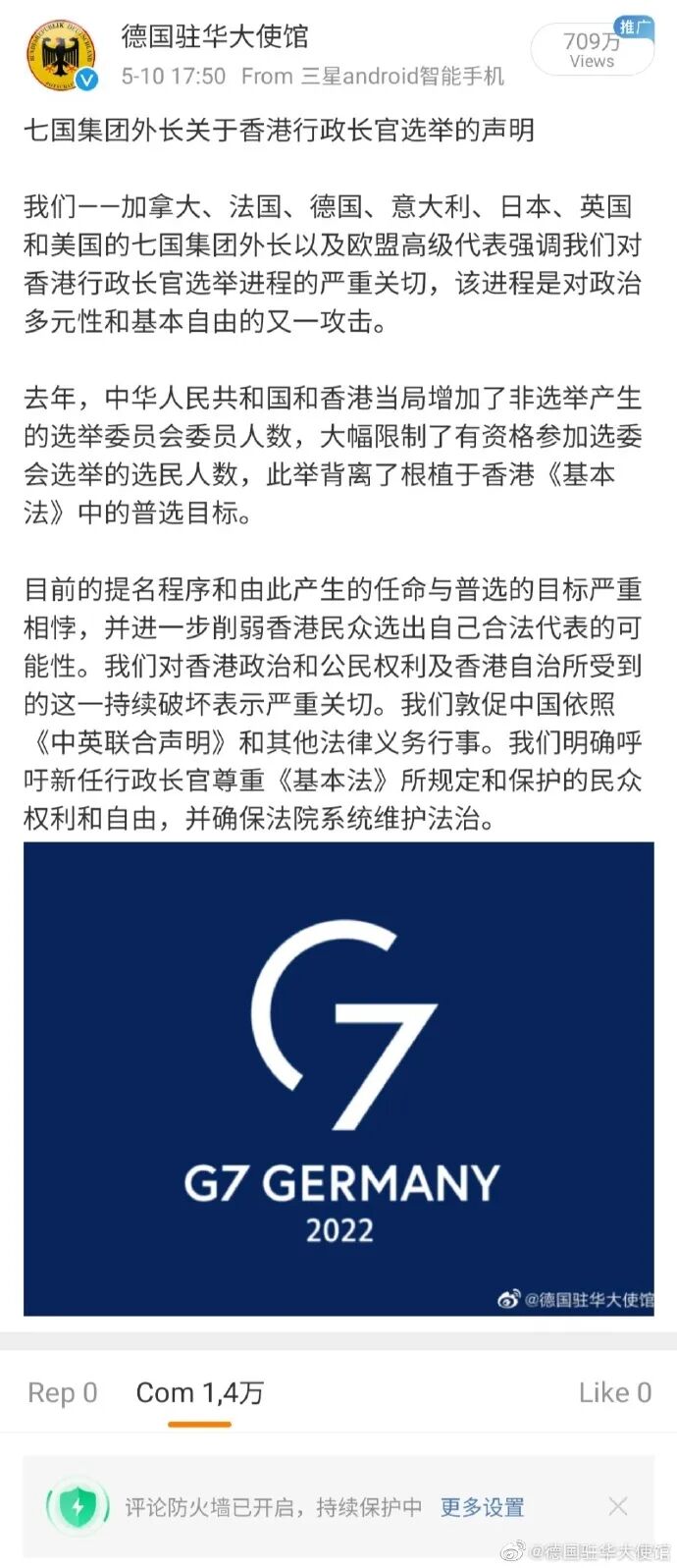 5月10日,德国大使馆在微博代表七国集团——美、日、德、英、加、法、意发布了一则声明。