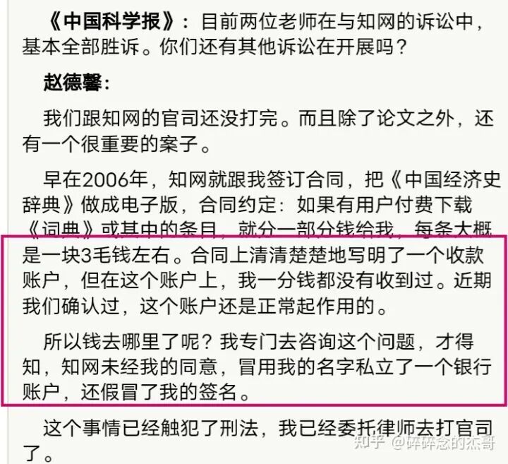 此前起诉知网获赔70多万的赵德鑫教授表示,2006年知网和他签订合同之后却假冒他的名义私设账户,自己的账户却一毛钱都没有收到。