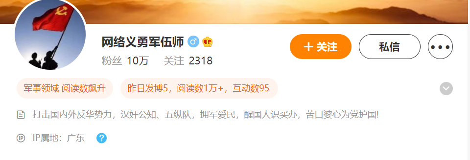 微博用户“网络义勇军伍师”(以下简称“伍师”)就嘲讽老胡为“公知”,这对一直和公知们战斗的老胡来说,可真是一口比天还大的黑锅。