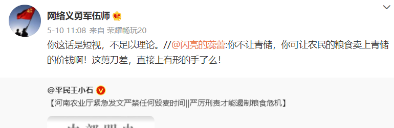 例如针对最近的青储小麦事件,“伍师”出于国家粮食安全考虑,驳斥提高粮价的建议为“短视,不足以理论”,无视农民想要提高收入的诉求,将农民当作了“代价”。