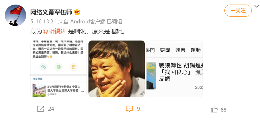 胡锡进,中国舆论场的风云人物,对外剑指美帝,炮轰台独,对内直言敢谏,忠心护国。
