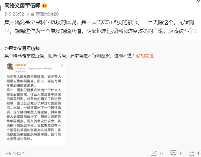 再如老胡针对上海不甚明晰的集中隔离政策,老胡给出建议,请求卫健委给出指导细则,以减少争议。这其实是替老百姓说了些好话,当然能否落实是另外一回事,本来无可非议。