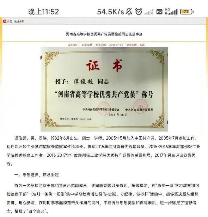 另外据网友爆料,谭俊超还曾获得过“河南省高等学校优秀共产党员”的荣誉称号,担任过学校的纪检监察干部。他思想进步,信念坚定,还承担《思想道德修养与法律基础》课程的教学任务。