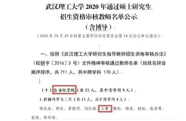 而到了2020年11月20日,武汉理工大学在发布的《关于学校2020年通过博士硕士研究生招生资格审核的教师名单公示》中,竟然有王攀的大名!