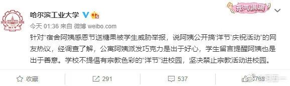 同时,哈工大也强调,学校不提倡有宗教色彩的“洋节”进校园,坚决禁止宗教活动进校园。这也给网友留下了巨大的想象空间,那位宿管阿姨到底有没有宗教信仰呢?这需要等待哈工大方面的更多回应。