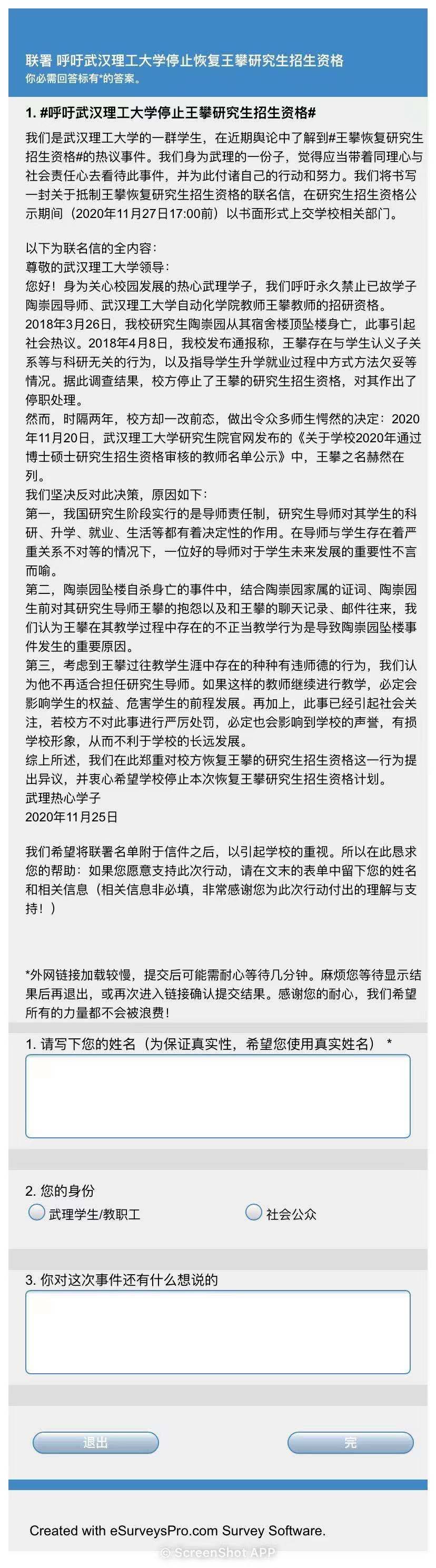 在武汉理工大学,部分学生从25日开始行动起来,抵制学校准备恢复已故学子陶崇园的导师王攀的招研资格。