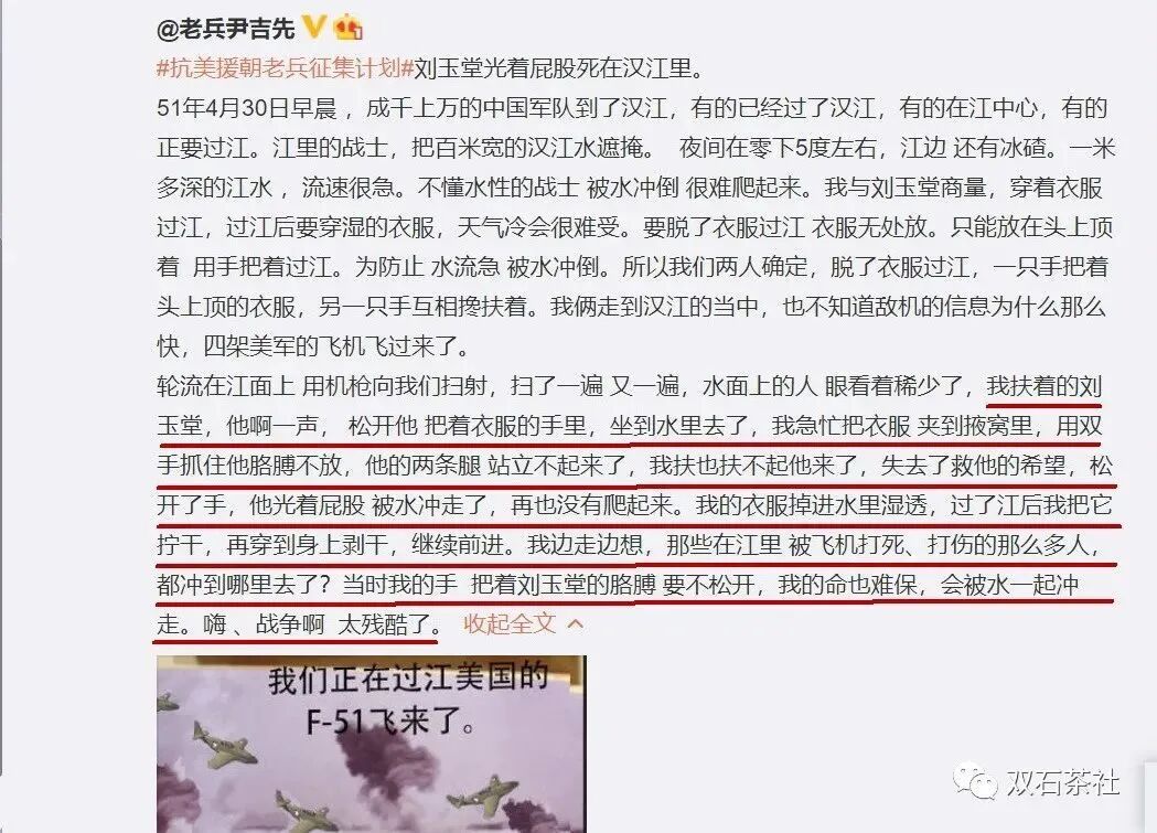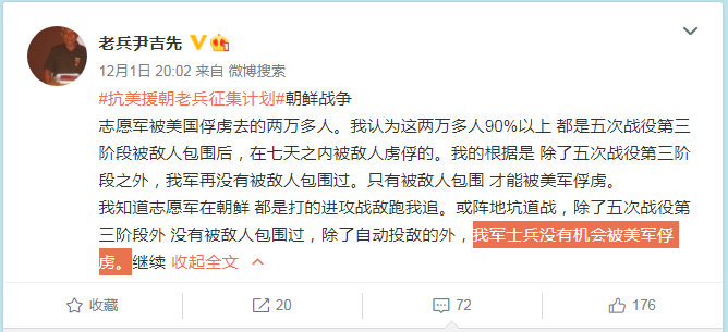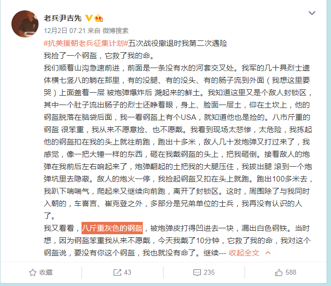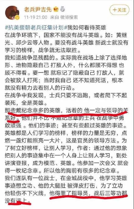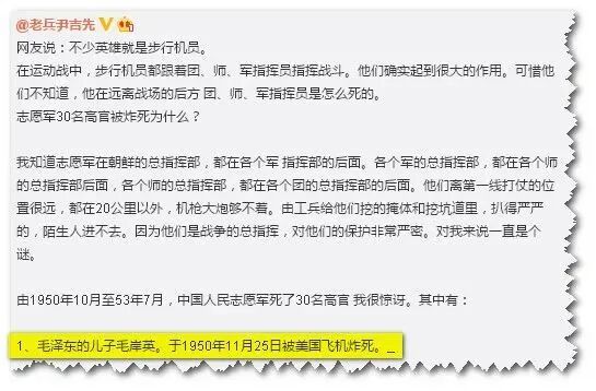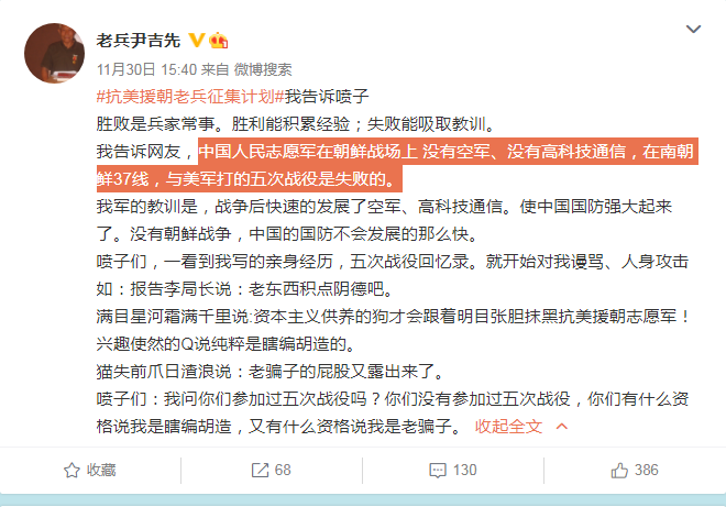 后来,@老兵尹吉先 不仅不知收敛和谨慎认真,反而更加频繁地发布抹黑志愿军的帖子,他的微博中,描述的诸多战争细节违背常识,与历史事实严重不符!