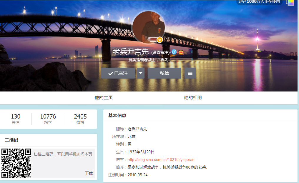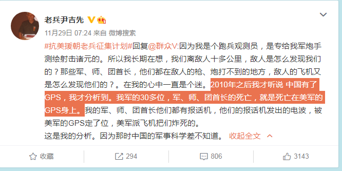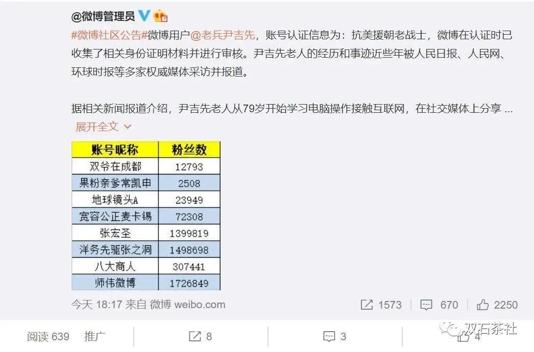最后,我们还看到,由微博发起的“#抗美援朝老兵征集计划”中,也把 @老兵尹吉先 从推广名单中拿下了!