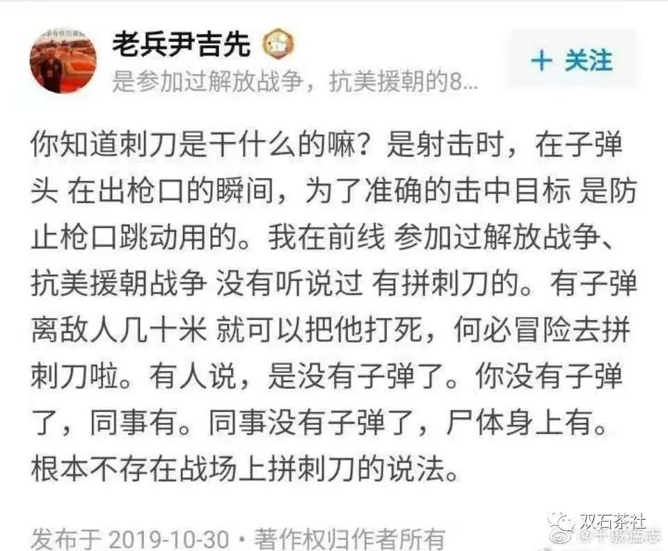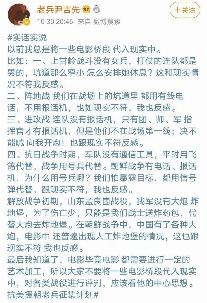 在这个帖子中,@老兵尹吉先 批驳反映抗美援朝战争的老电影《上甘岭》、《英雄儿女》中的许多桥段造假。他以一个志愿军老兵的身份说,上甘岭战役没有女战士,阵地战通讯不用报话机,电影中王成用报话机呼喊向我开炮是造假,志愿军使用炸药包炸碉堡是造假……