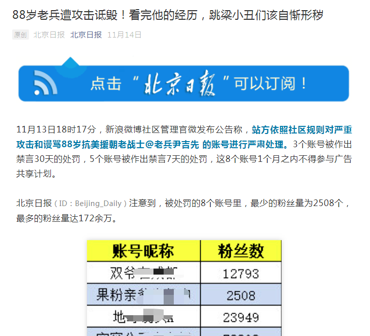 可是,得到的结果却是11月13日,@微博管理员对严重攻击和谩骂抗美援朝老战士@老兵尹吉先的8个账号(@双爷在成都、@果粉亲爹常凯申、@地球镜头A 、@宽容公正麦卡锡、@张宏圣、@洋务先驱张之洞、@八大商人、@师伟微博)作出禁言处罚!