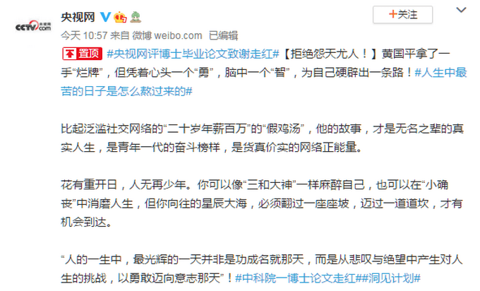 各大媒体纷纷报道,而央视的观点则比较典型,该评论强调“拒绝怨天尤人,奋斗成就人生”,同时批判一下颓废懒惰的“三和大神”们,满满的正能量。评论区的不少读者表示自己有类似的经历,要学习黄国平博士,努力改变自己的人生。