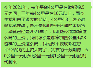 例如风雨无阻的外卖员,努力跑单,工作时间越来越长,单价却越来越低。所以有骑手吐槽,“XXX,一块钱的单你们也要跑吗?”