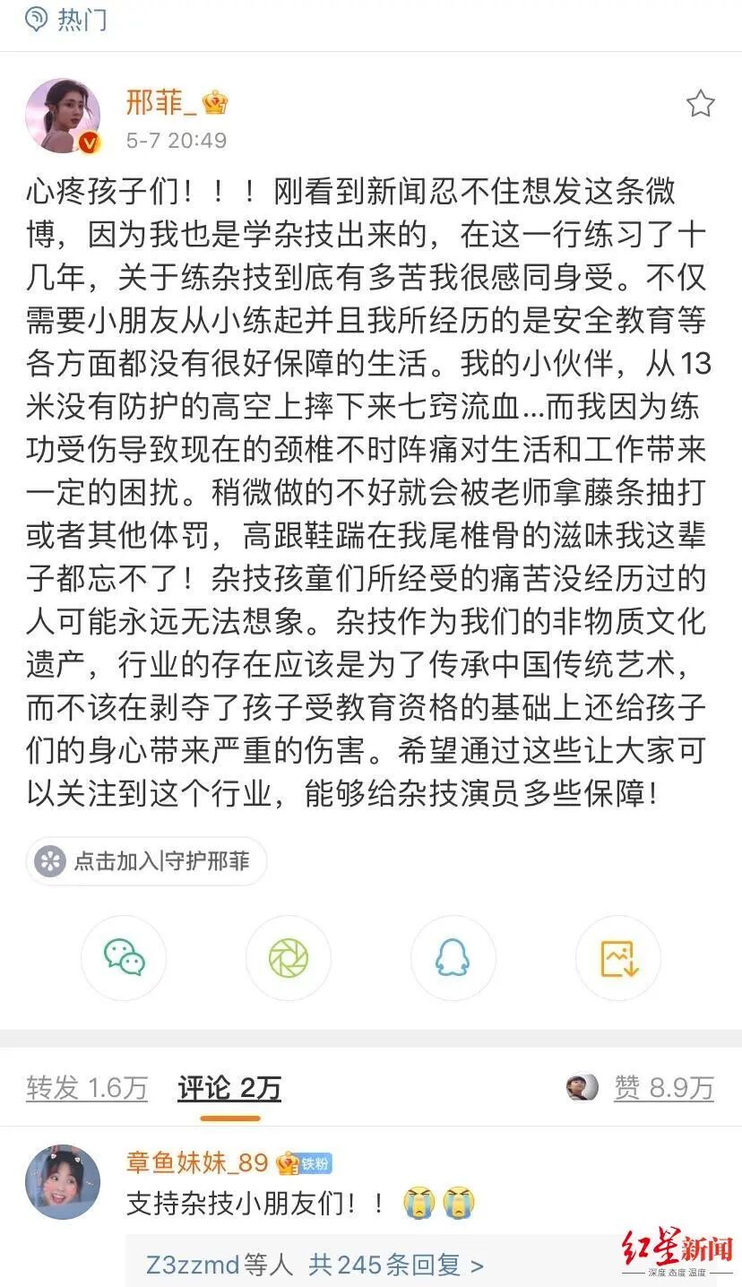 杂技出身的演员邢菲也表达了对孩子们的同情,她说杂技学徒挨打受伤是家常便饭,呼吁不要在剥夺了孩子受教育权的同时再使孩子们的身心收到伤害。但除了这些,这些孩子在四到五年的“学习”中,还几乎无偿地为了老板们创造了不菲的剩余价值。