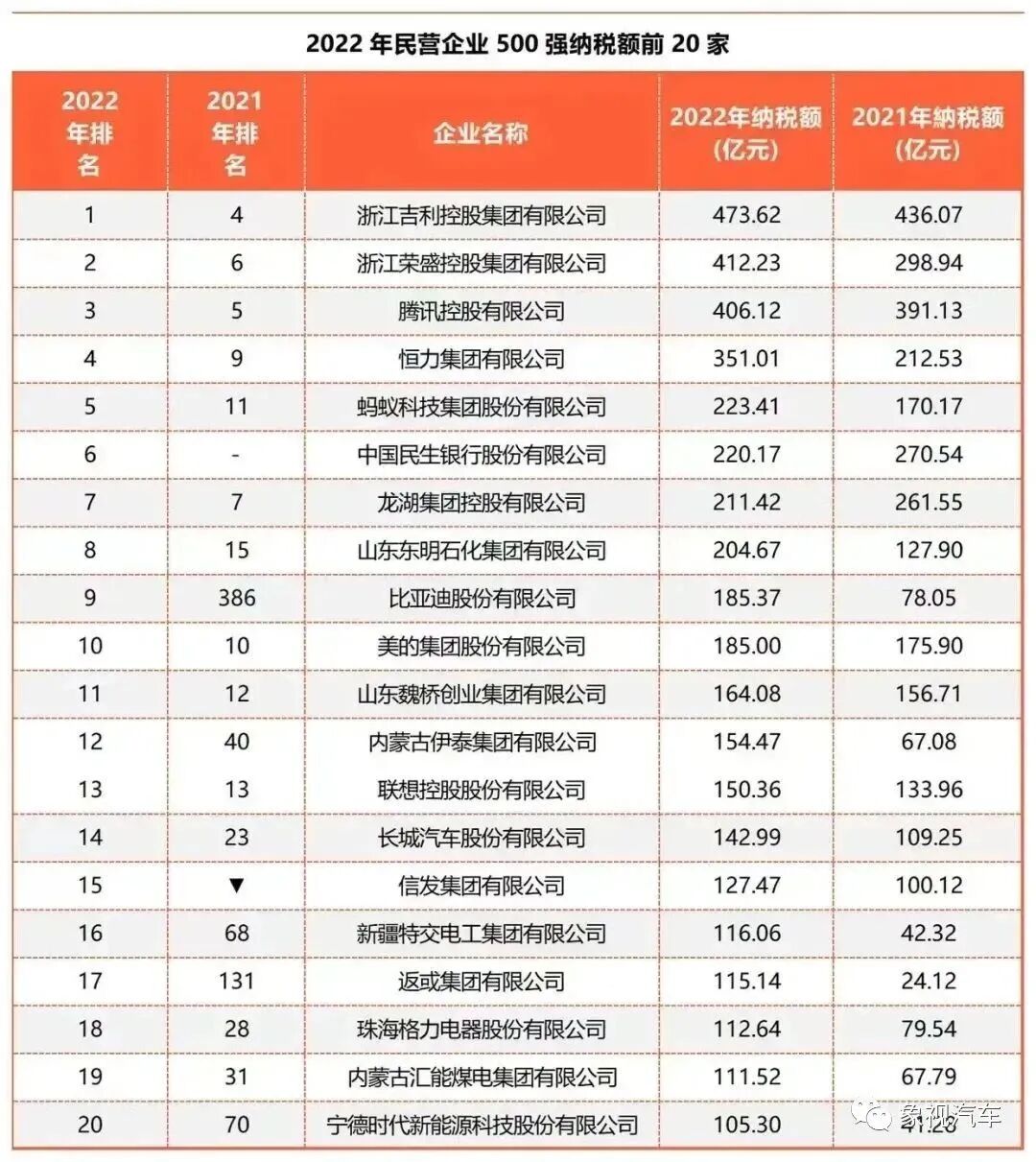 与此同时,民营企业500强纳税额前20强名单也公布了。出乎所有人的意料,民企第一纳税大户,居然是车企吉利。