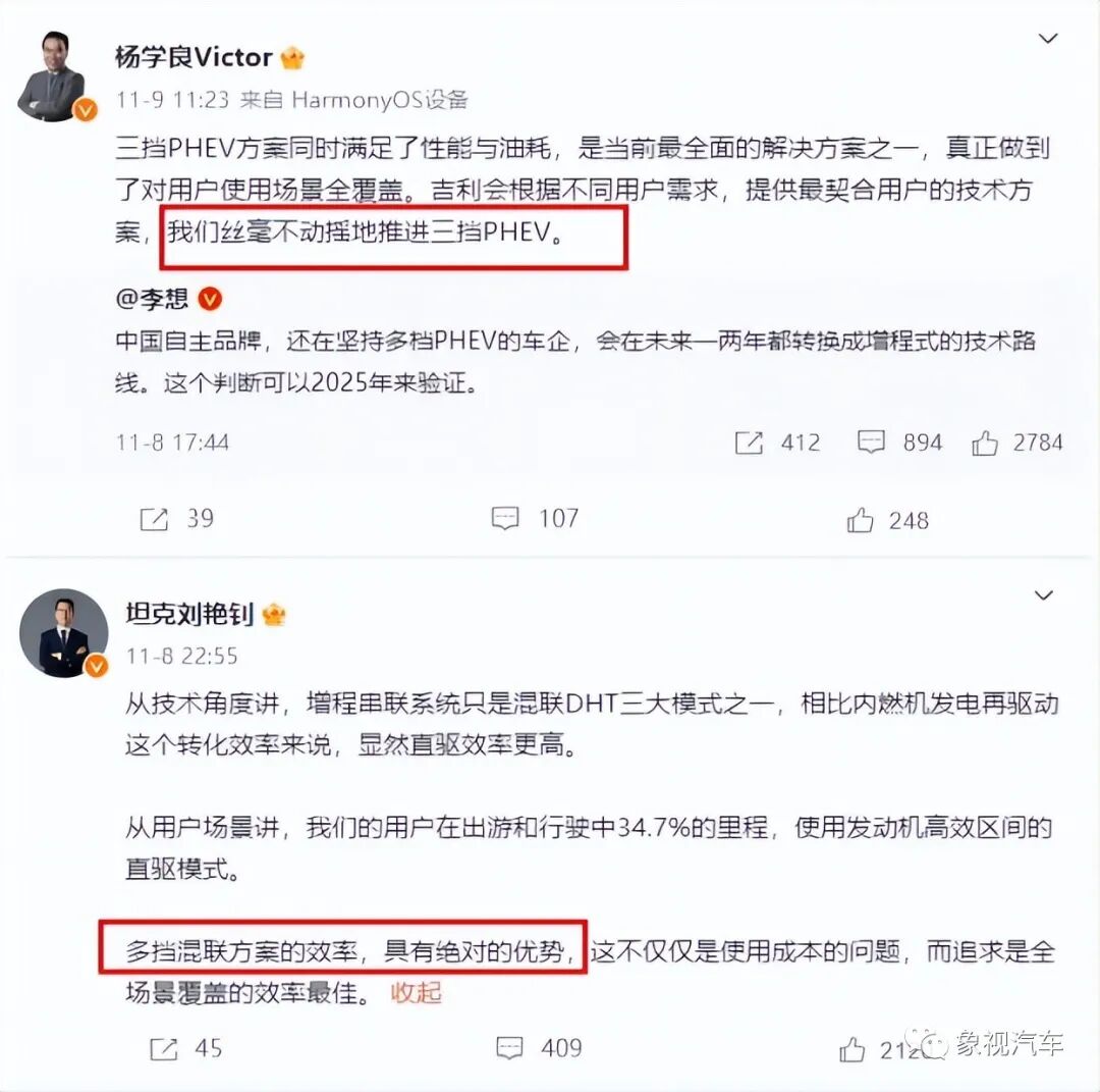 吉利副总裁杨学良表示:“我们丝毫不动摇地推进三挡PHEV。”长城魏牌总经理兼任TANK品牌总经理刘艳钊回应:“多挡混联方案的效率,具有绝对的优势。”