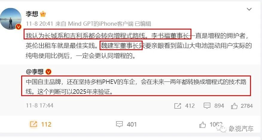 不仅仅简单立下一个flag,李想甚至直接点名魏建军和李书福,直言“我认为长城系和吉利系都会转向增程式路线”。
