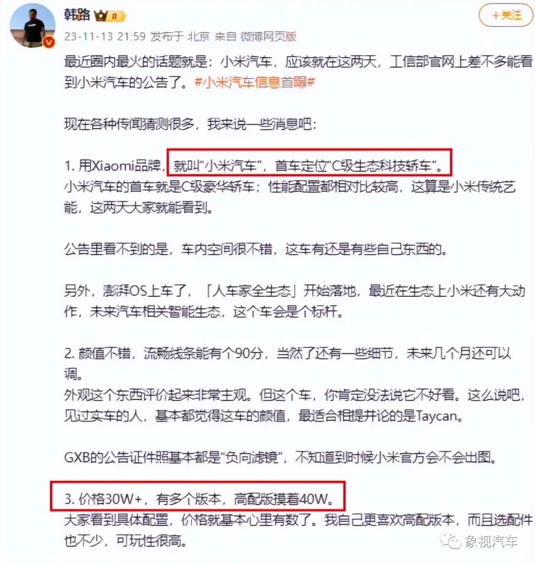 小米SU7亮相之后,有车评人爆料称,其起售价超出30万元,高配版高达40万元。如果属实的话,雷军造车肯定会以失败告终。