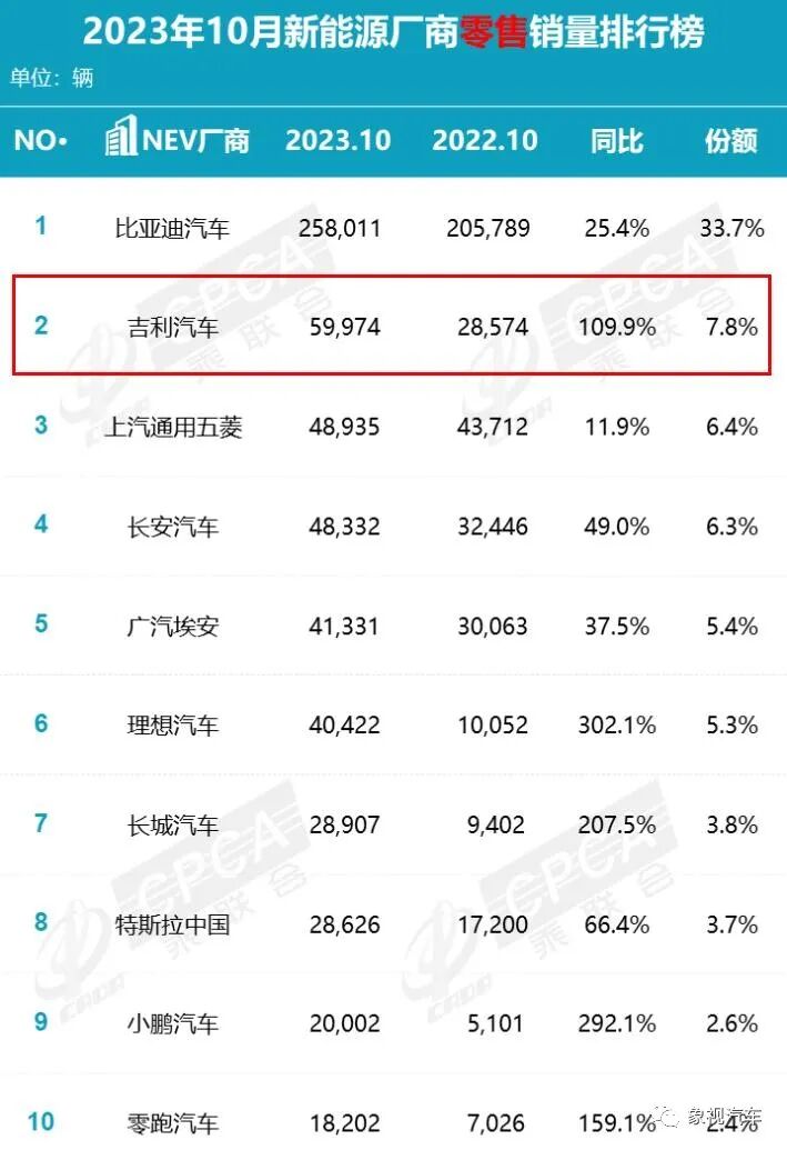 乘联会今年10月新能源厂商零售销量排行榜显示,吉利以近6万辆的销量成绩,高居第二位,远超长安、埃安、理想、小鹏等,仅次于比亚迪。