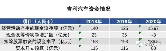 最后,吉利很缺钱,资金吃紧。与沃尔沃合并上市受挫,回归A股创业板也失败,吉利股权融资渠道频频不顺。开支大增、营收下滑,叠加吉融资渠道一定程度上的受阻,导致吉利资金链开始紧绷。数据显示,2020年吉利现金流量净额仅为15.97亿元,而2017-2019年分别为120亿元、140亿元和125亿元;2020年吉利现金及现金等价物净值减少了3亿元,而2018年和2019年则增加23亿元和35亿元。