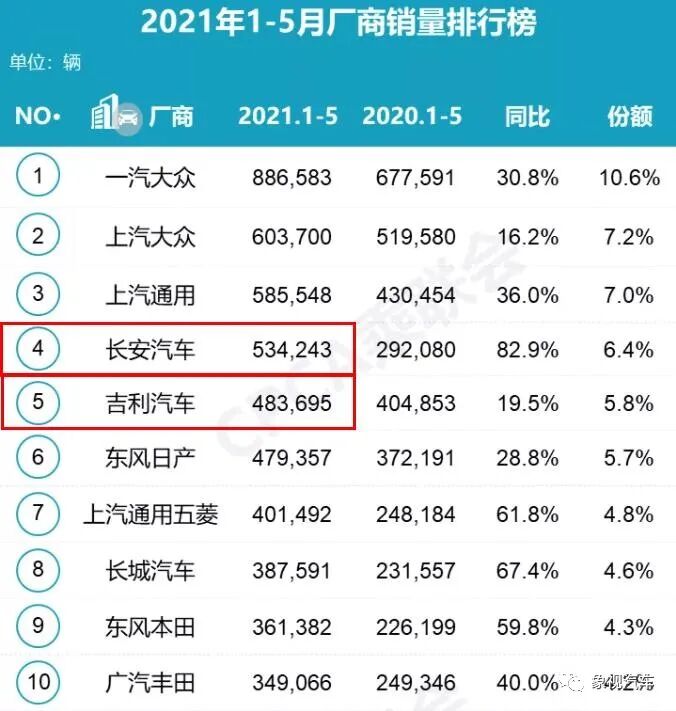 市场本来认为这只是暂时的,但没想到吉利连续5个月,销量都不及长安。今年1-5月份,长安汽车累计销量为53.4万辆,吉利汽车还不及48.4万辆,差距扩大到5万多辆。
