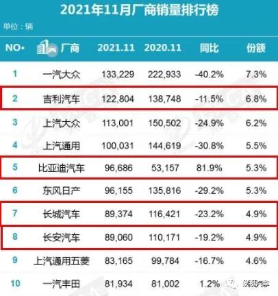 需要特别指出的是,吉利11月挨了当头一棒,还表现在被后来居上的比亚迪和长城相继超越,首次丢失了自主三强的宝座,堪称遭遇滑铁卢。