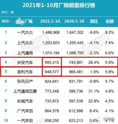 即使吉利从6月份开始奋起追赶,但是直到10月份,长安依然以95.54万辆的累计销量,力压吉利的94.86万辆,稳坐在自主销冠的宝座上。