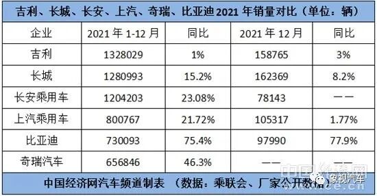 吉利132万辆的销量看似很多,但我们还是要泼一盆冷水,这个数据距离今年年初所定的153万辆目标,相差甚远,只完成销量目标的87%。同时,吉利2021年的销量同比增长幅度只有约1%,而同期长城销量同比增长幅度高达15.2%,长安的则为23.08%。