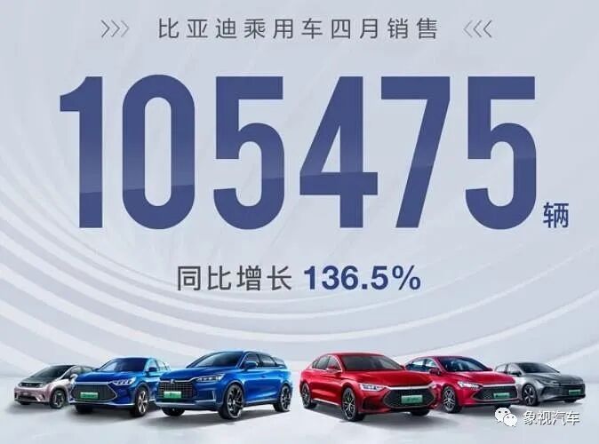 比亚迪4月总销量为105475台,以较大领先优势,首次车企销冠。其中DM混动车型售出48072台,EV纯电车型售出57403台。这也是比亚迪连续第二个月,销量突破10万辆大关。