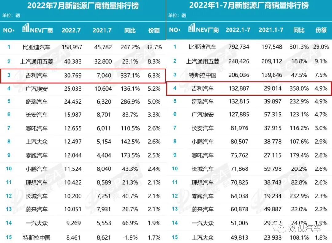 乘联会数据显示,7月新能源车车企销量榜上,吉利汽车同比上涨337.1%,以30769辆的销量,首次杀入榜单前三强,位列第三位,仅次于比亚迪和上汽通用五菱。