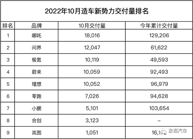其中,问界10月交付量高达12047辆,高居第二位,仅次于哪吒;吉利极氪则有10119辆,位居第三名。