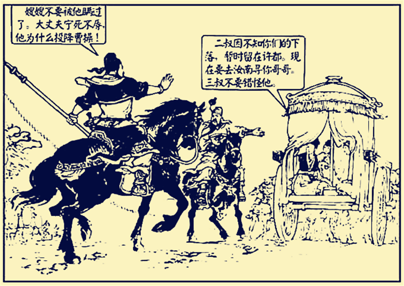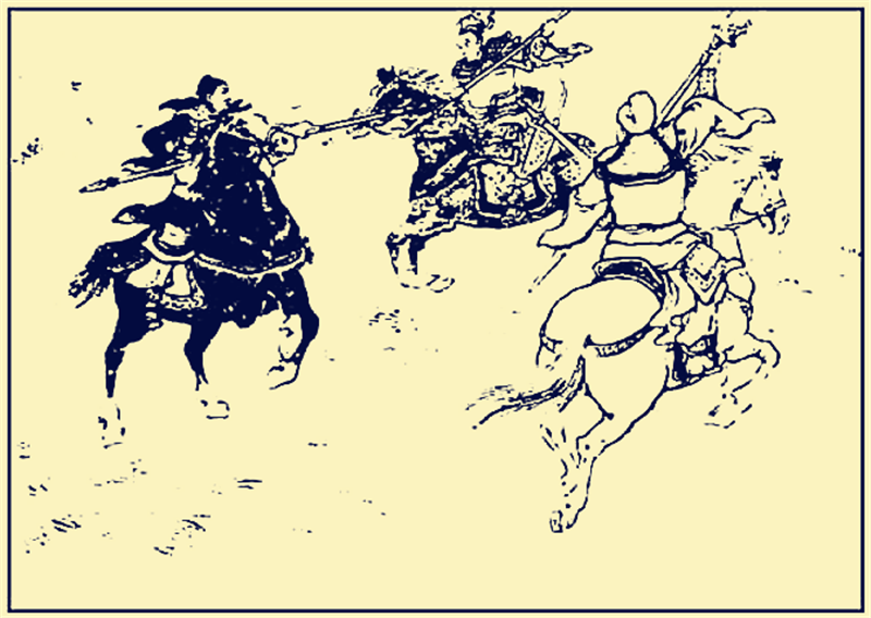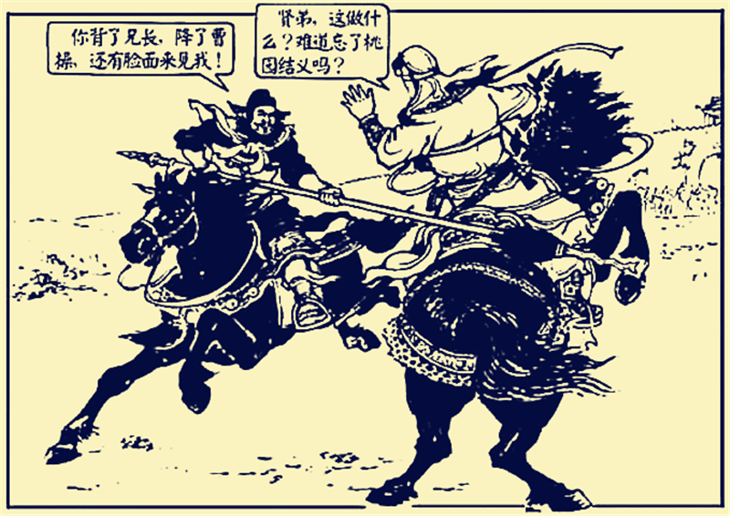 关公望见张飞到来,喜不自胜,付刀与周仓接了,拍马来迎。只见张飞圆睁环眼,倒竖虎须,吼声如雷,挥矛向关公便搠。关公大惊,连忙闪过,便叫:“贤弟何故如此?岂忘了桃园结义耶?”