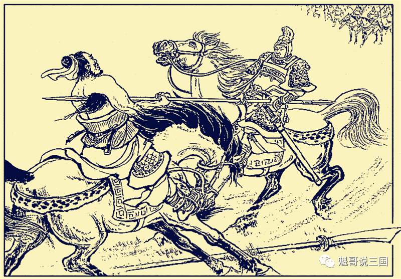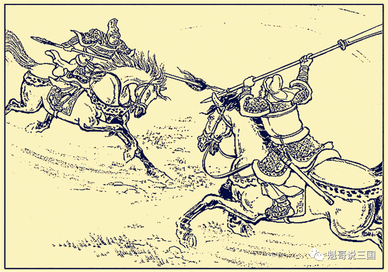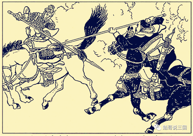 两个又斗到三十余合,褚奋威举刀便砍马超。超闪过,一枪望褚心窝刺来。褚弃刀将枪挟住。两个在马上夺枪。许诸力大,一声响,拗断枪杆,各拿半节在马上乱打。操恐褚有失,遂令夏侯渊、曹洪两将齐出夹攻。